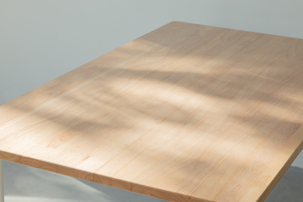 スッキリ感を醸し出しながらも、しっかりとした安定感を発揮できる厚み2.5cmの天然無垢材を贅沢に採用。天然素材にしかない温もりと優しい手触りをより楽しんでいただくため、あえて保護塗装を減らし、自然な感触を楽しめる仕上がりとなりました。
