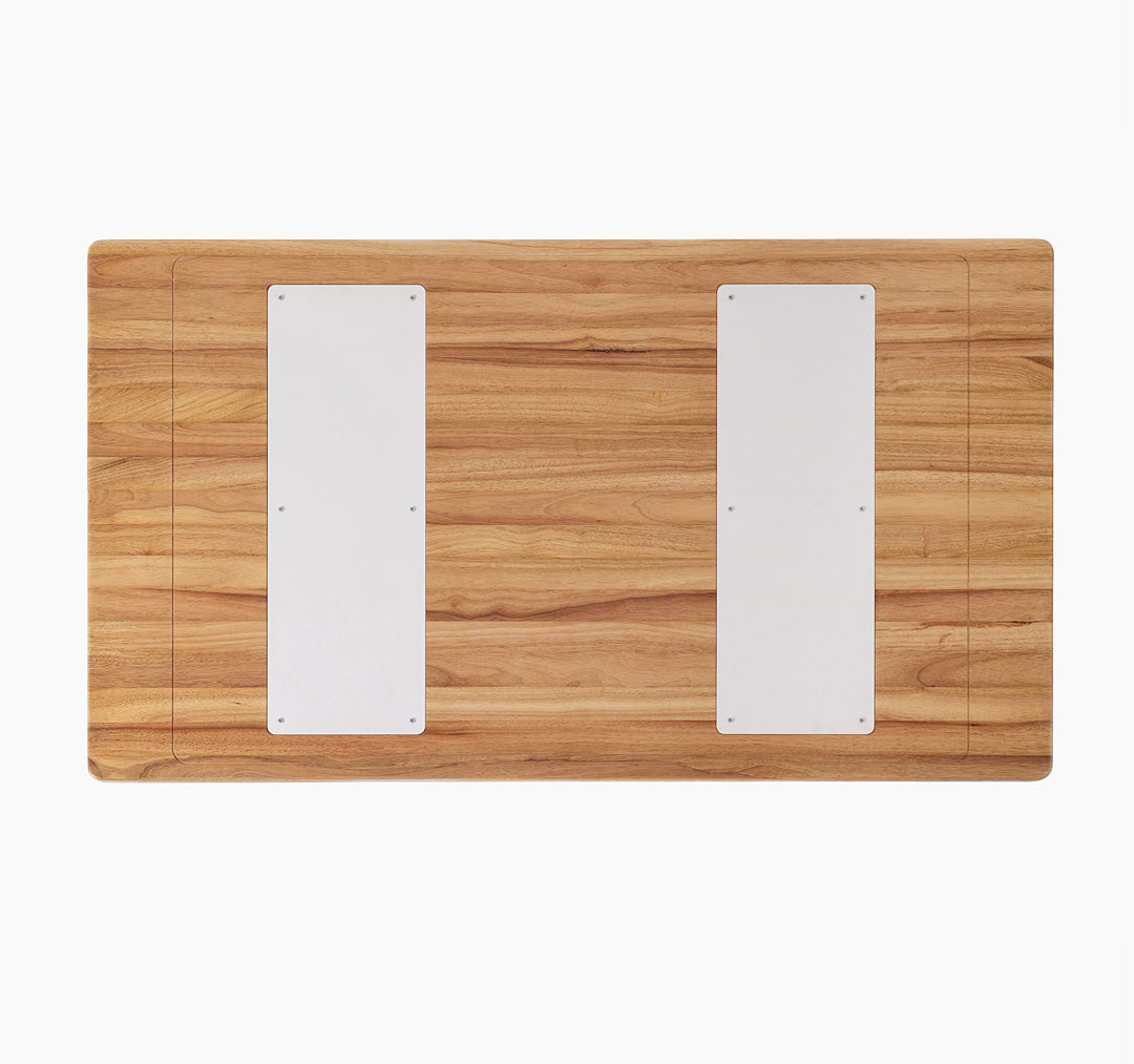 長年使うと歪みがちな天然無垢材の欠点をカバー。天板裏には耐久性を向上させる強化スチール構造を採用しています。