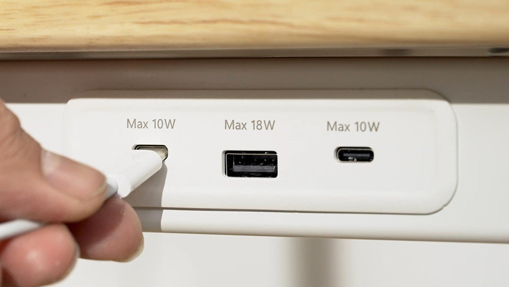 コンセントの位置を慌てて探さずとも、よく使うUSBポートを3口、デスク本体にスッと馴染むように手元に配置しました。Type-C (10W)を2口、Type-A (18W)を1口で様々なモバイルデバイスへの充電が可能です。
